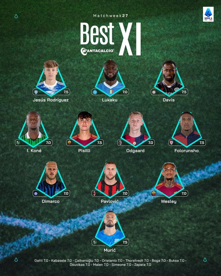中场:I·科内(萨索洛)、皮西利(罗马)、奥德加德(博洛尼亚)、弗罗伦肖(卡利亚里)